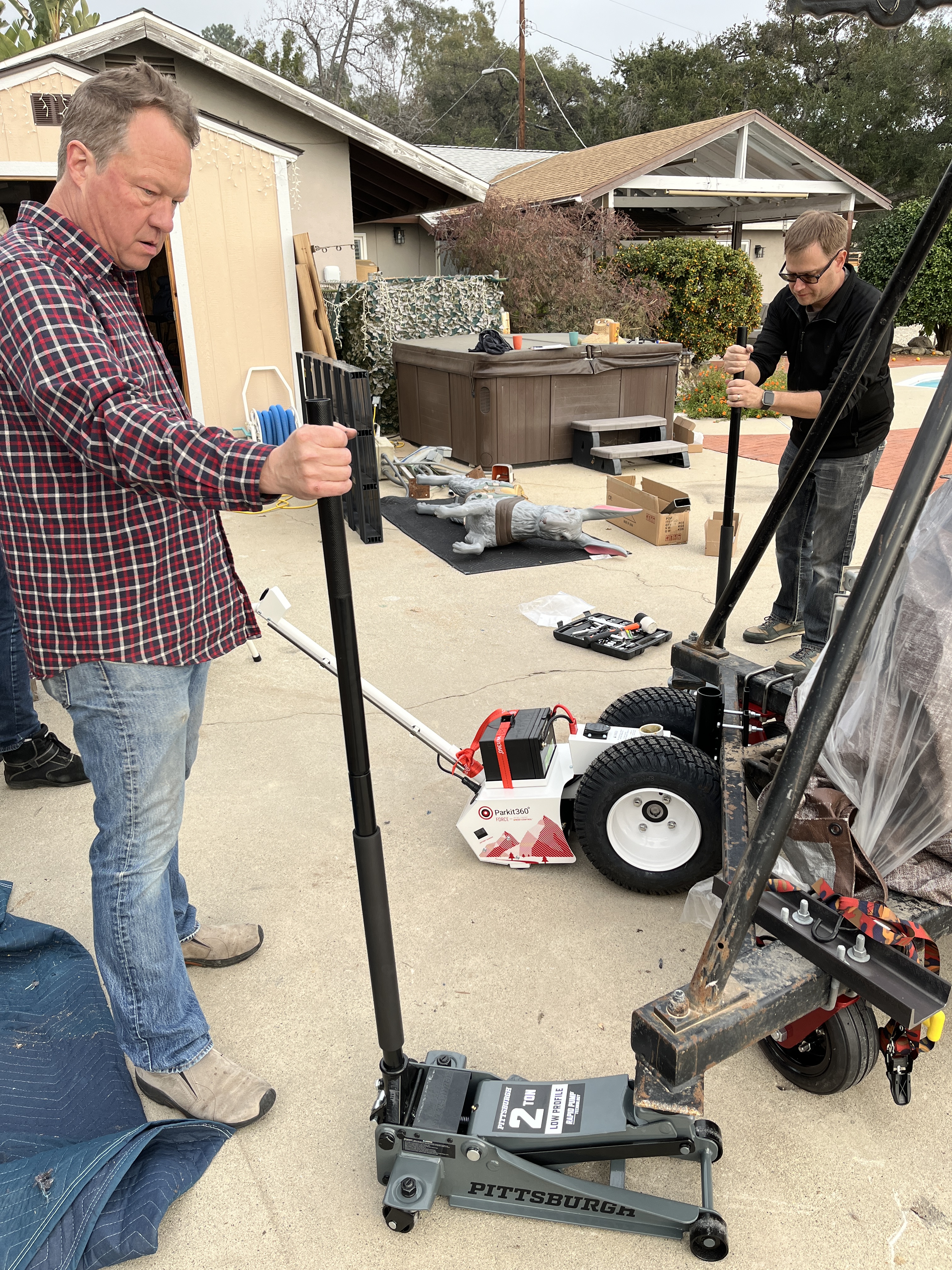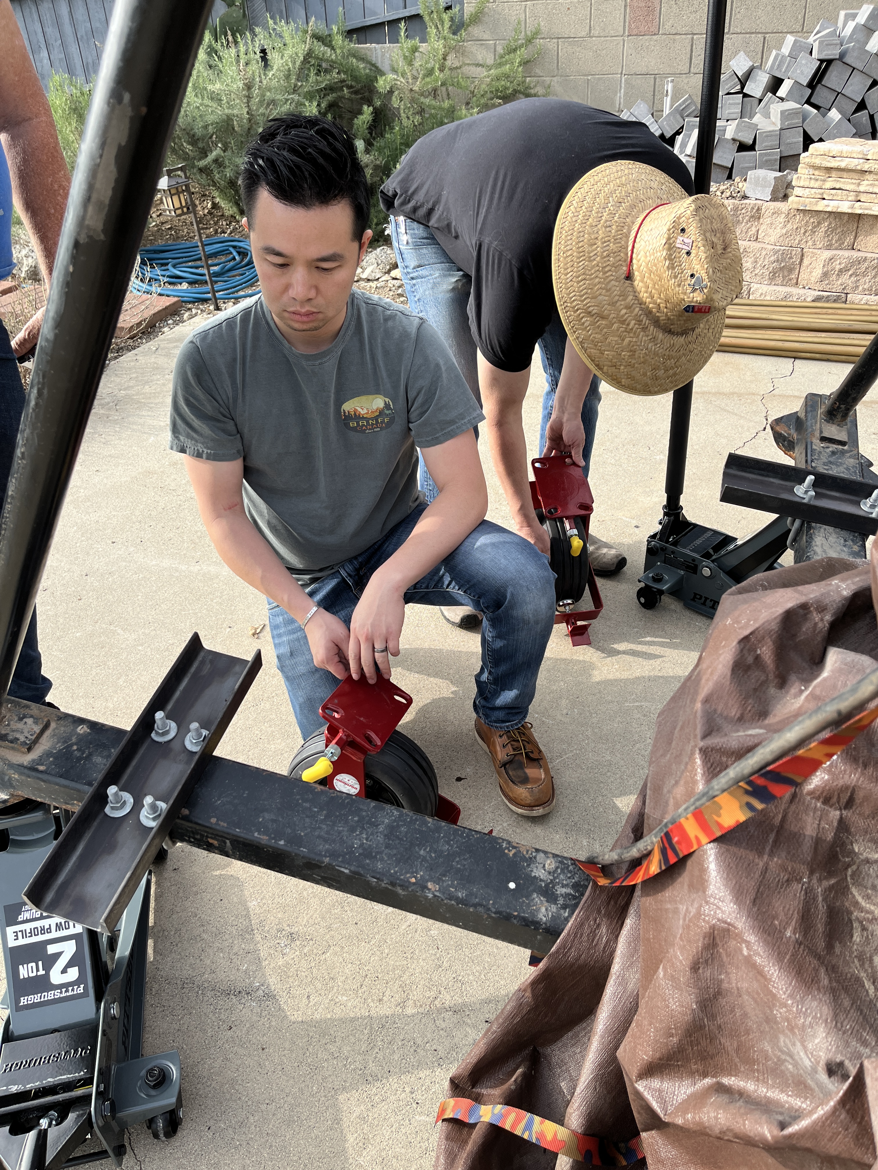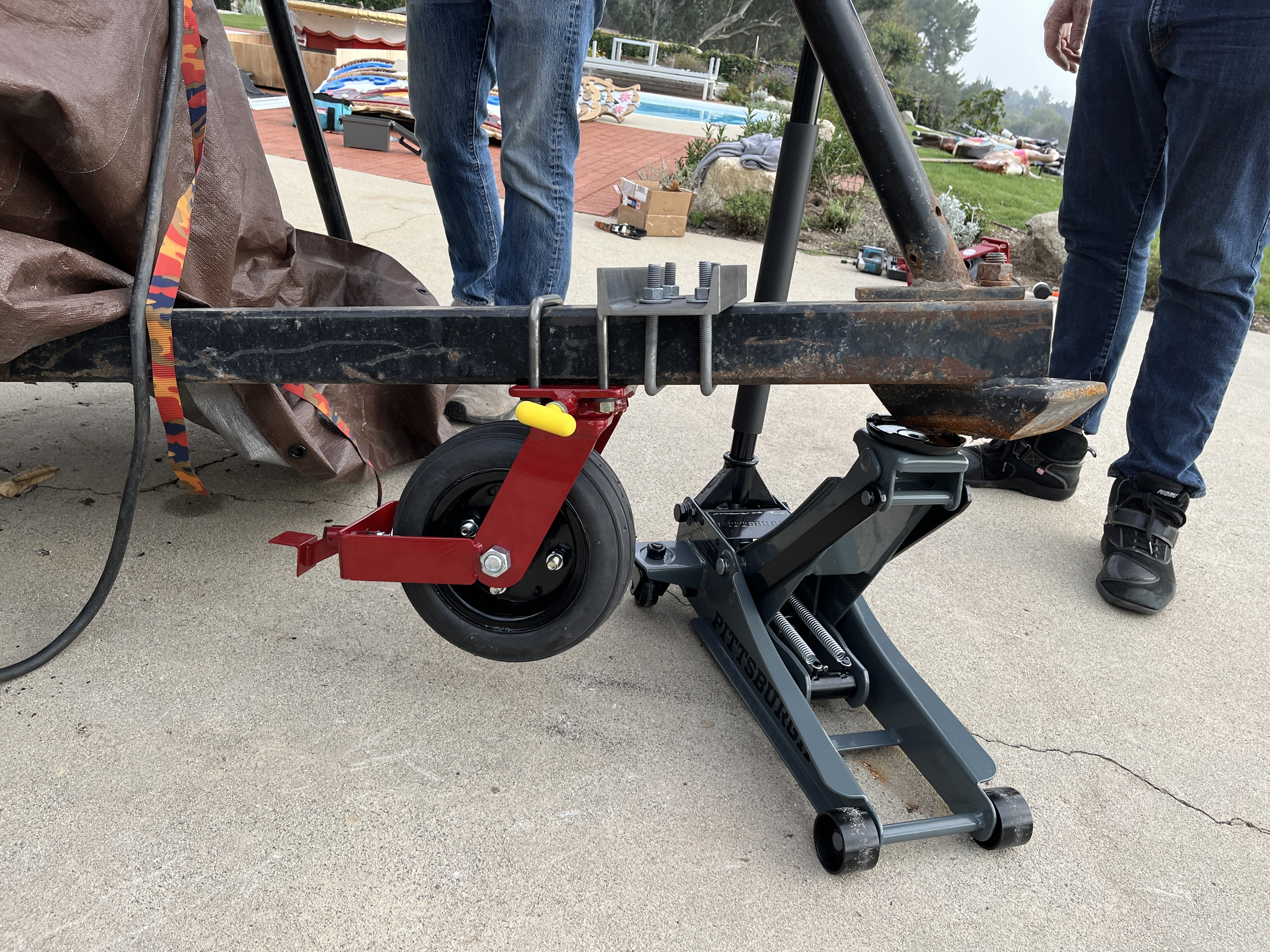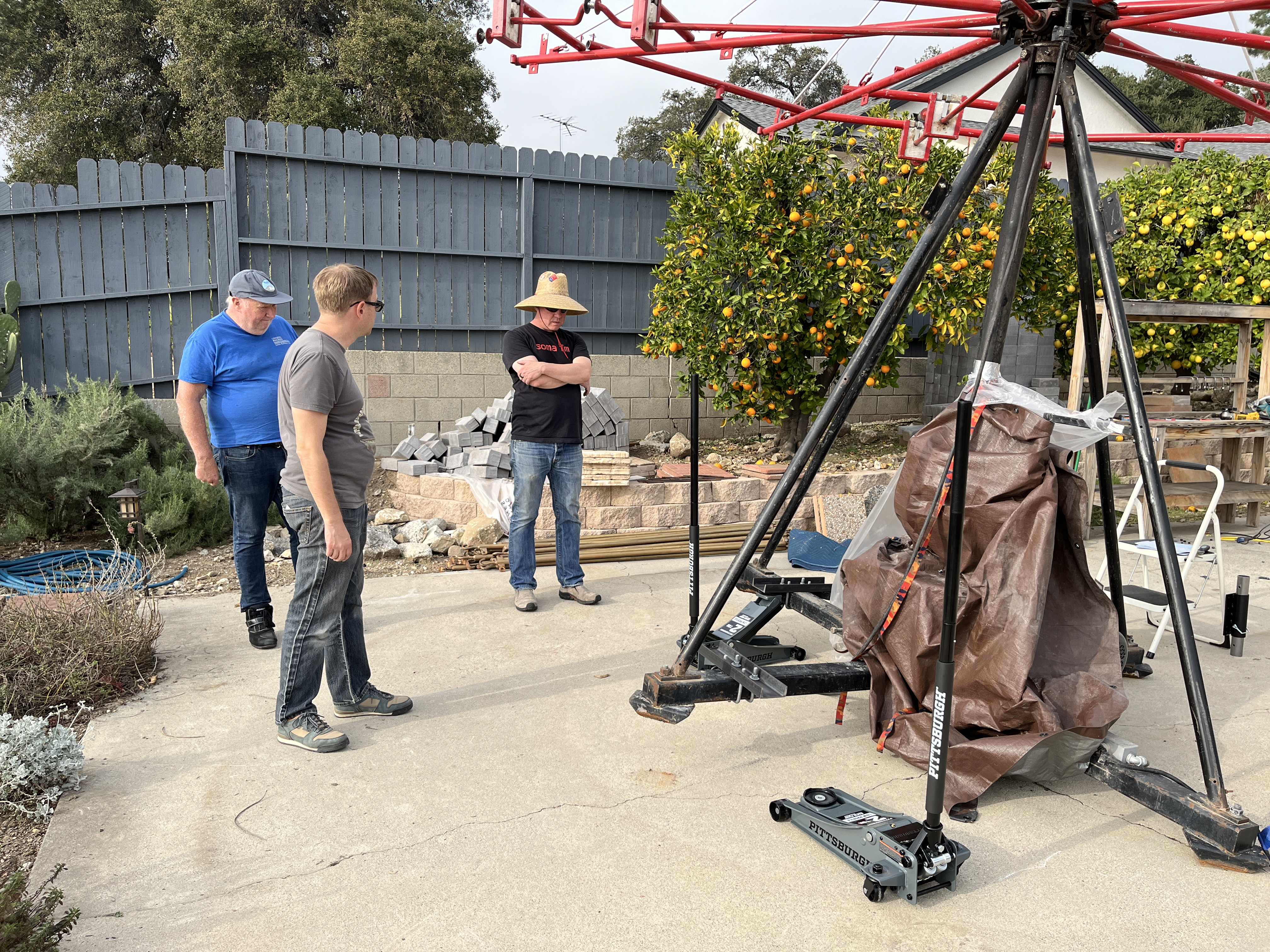 2/17/24 – The base of the carousel weighs about 2000 lbs, and since we intend to travel with it, we needed to figure out how to move it without the use of heavy equipment. Here we are testing the equipment we designed to be able to transport it. You can see a video on our Facebook page.